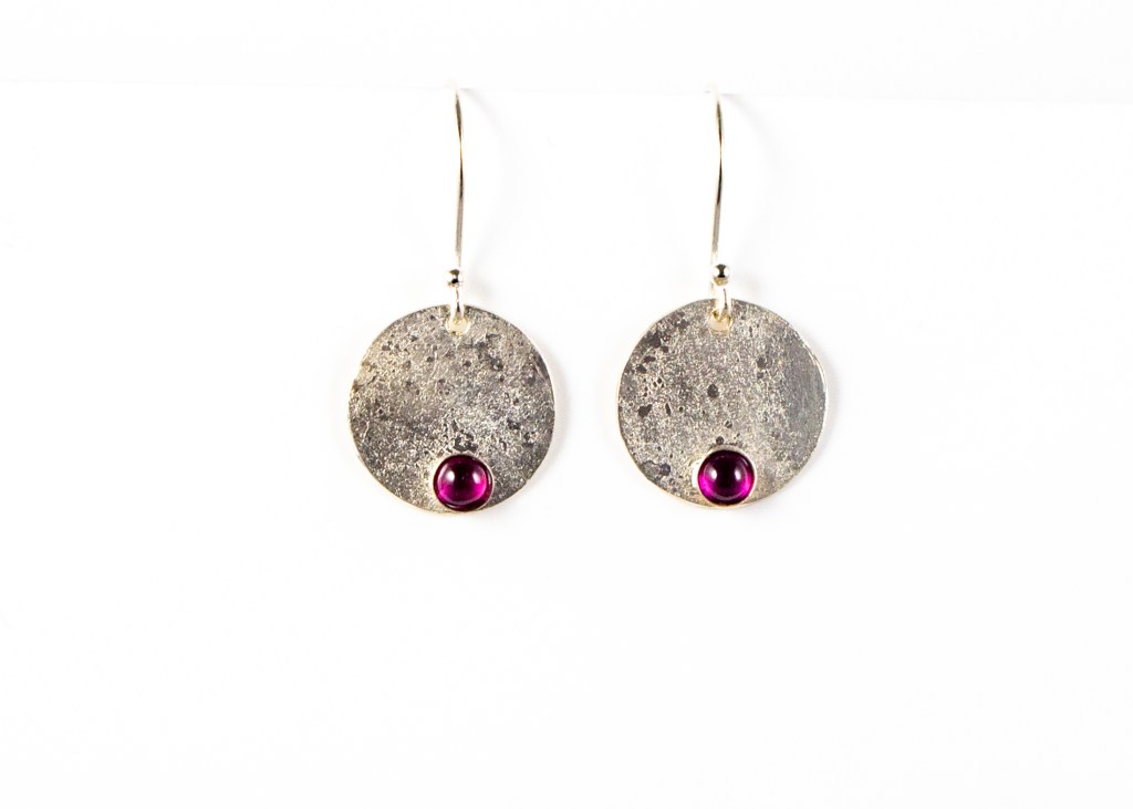 Stunning sterling silver drop earrings with moonscape finish and cabochon amethyst.