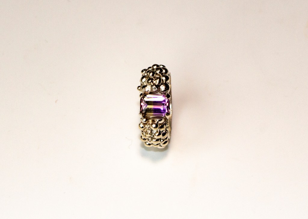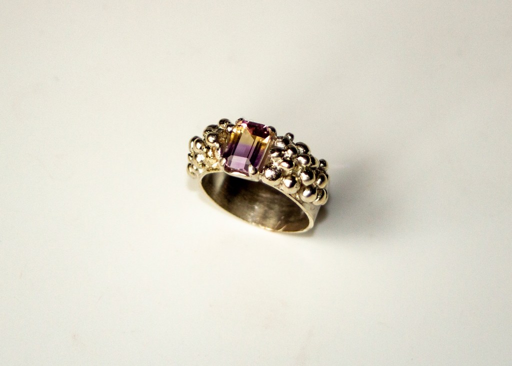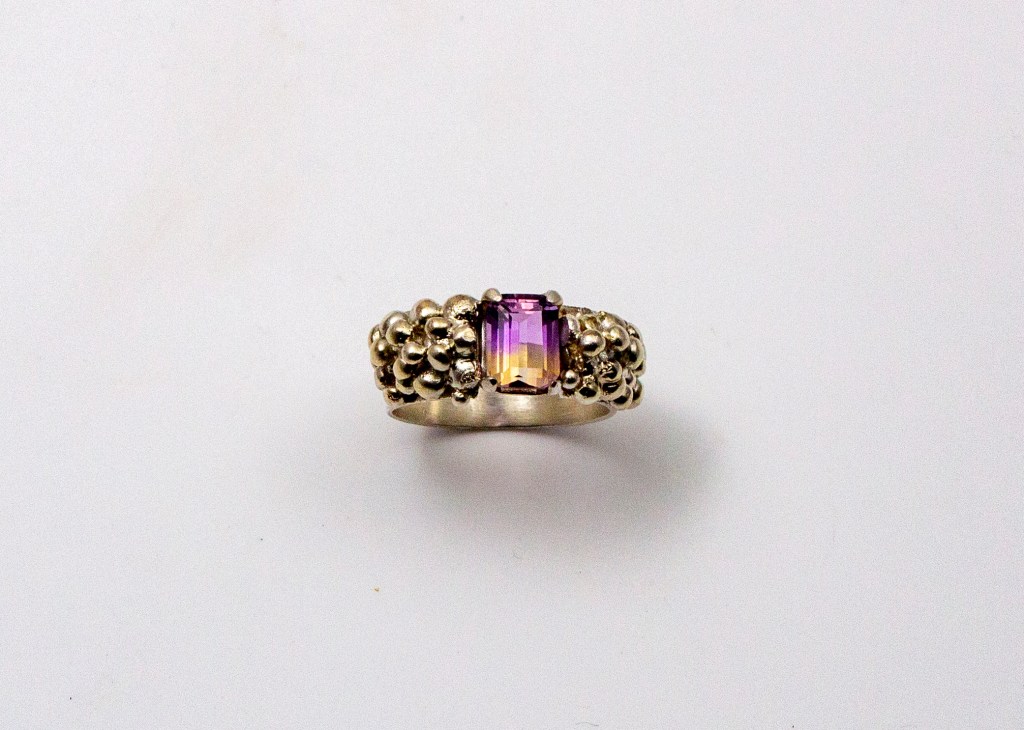 A real statement ring. An emerald cut ametrine stone set in a band with “grapes” motive. The stone’s colour goes from light purple to orange/yellow.