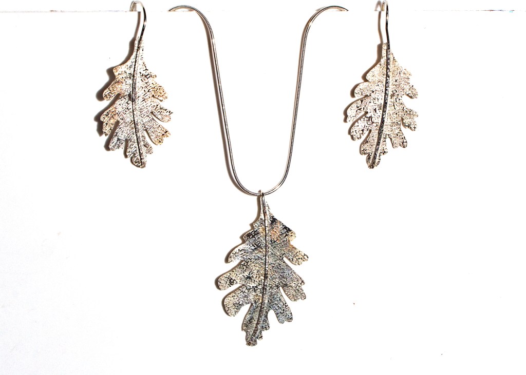 A delightful oak leaf in sterling silver with a chiffon finish. It hand from a box chain. Light but sturdy it can be worn all day and the special finish will reflect the light. A stunning addition to any attire.