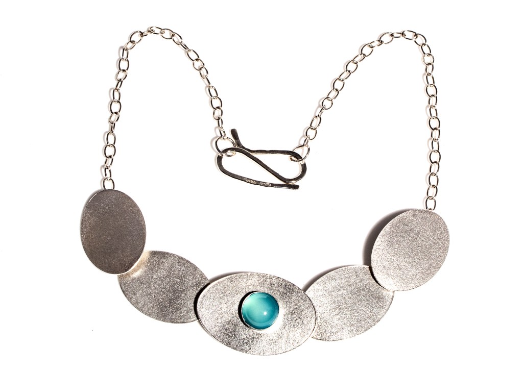 A stunning necklace in sterling silver with 5 overlapping ovals and a central big sea green agate with a trace chain and sliding clasp. The ovals finish is matte. the necklace is quite light in spite of the size.
