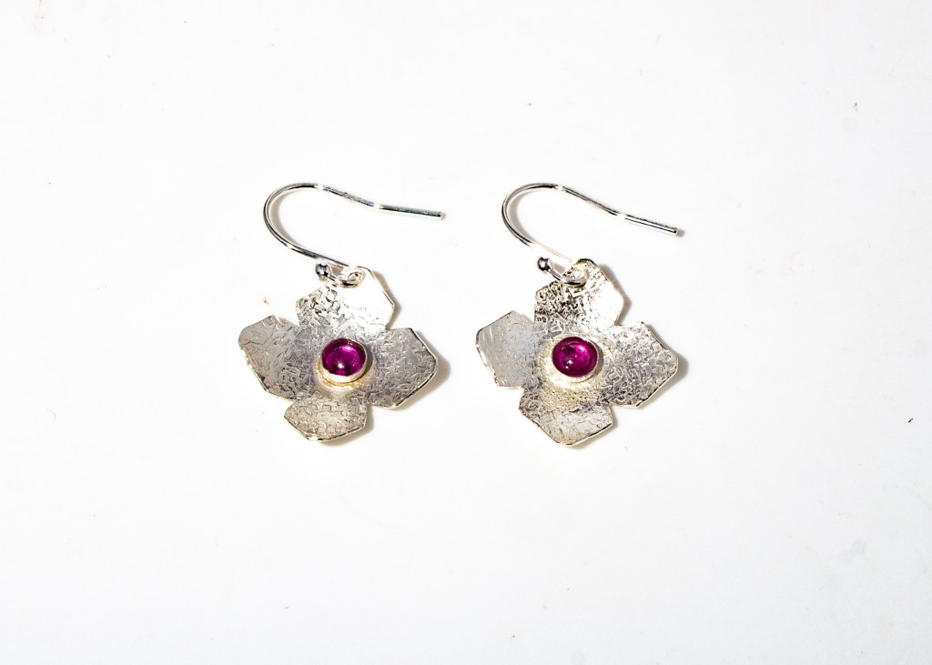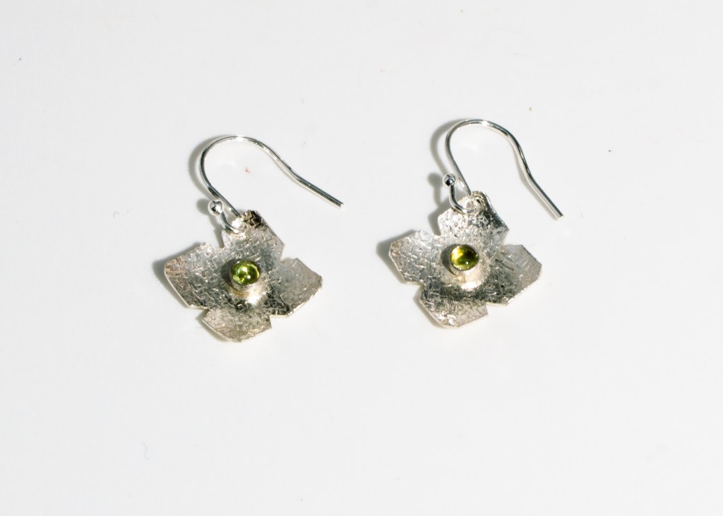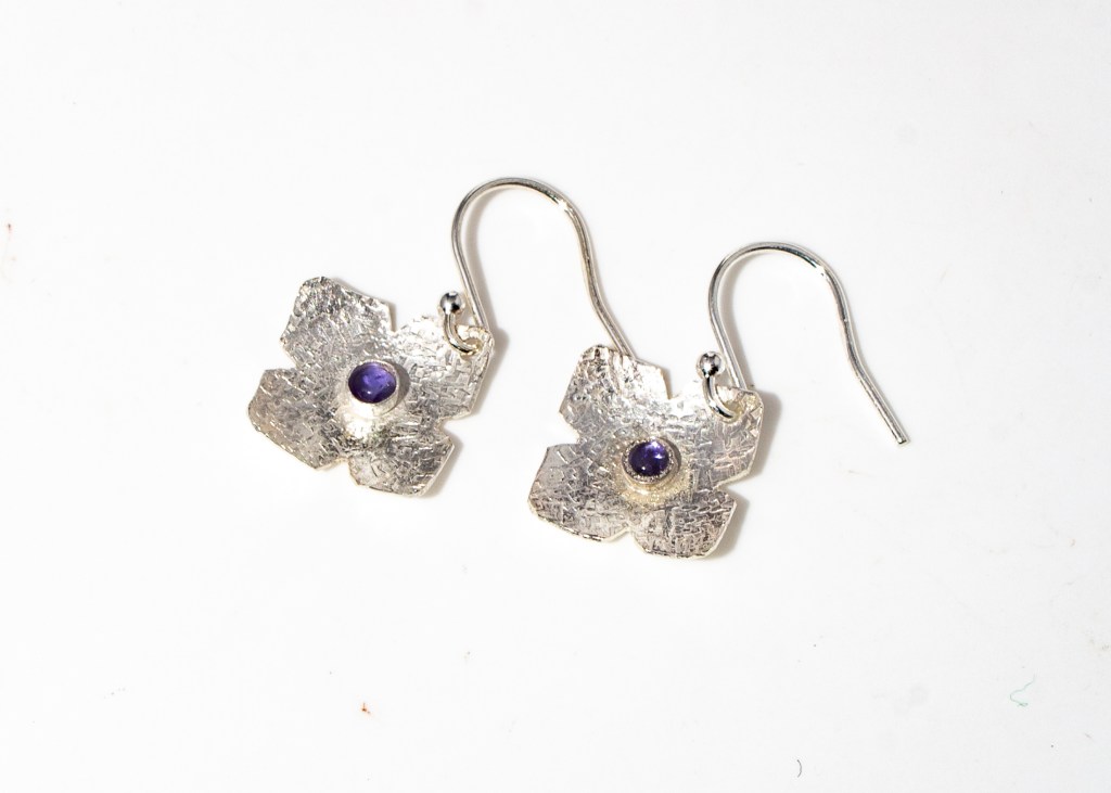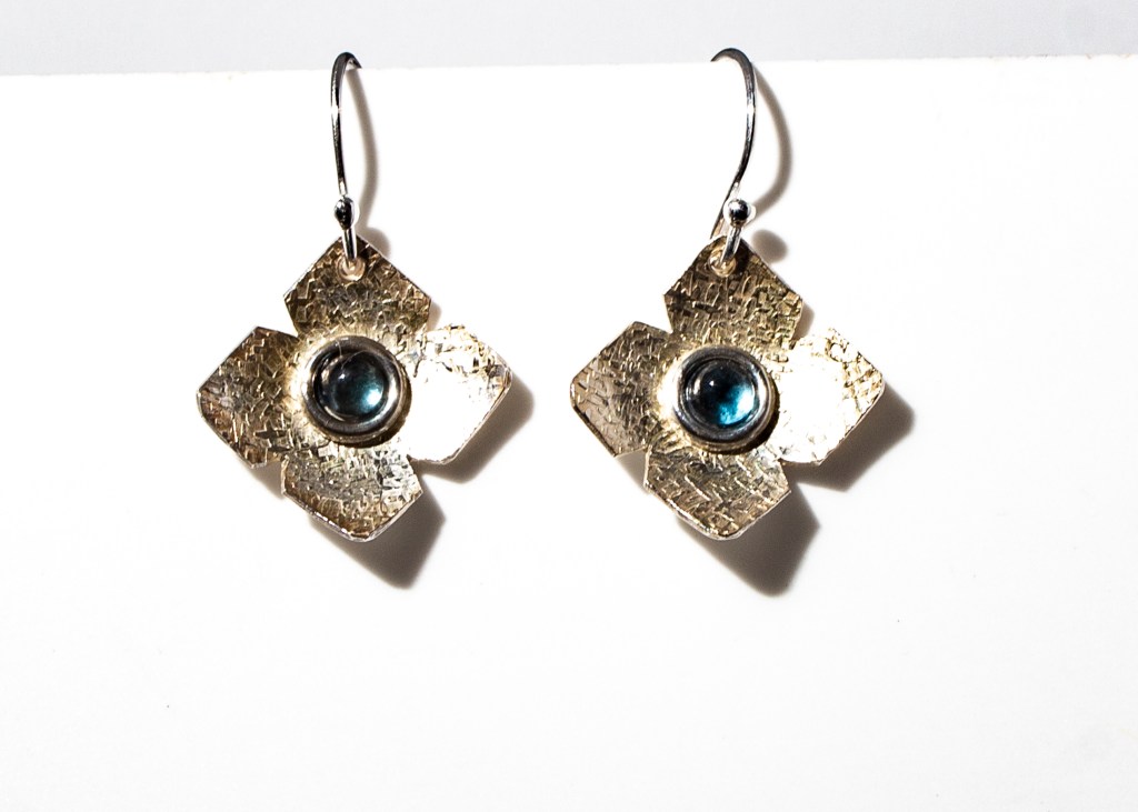 Very dainty flower earrings with moonscape or chiffon finish and various cabochons as per descriptions and pictures below:
